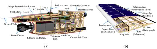 The structure of MP Solar UAV was a traditional beam-rib structure made of carbon, KEVLAR, and balsa wood. The beam of the main wing was a rectangular hollow section beam consisting of rectangular carbon tubes arranged up and down and walls with lightening holes. The rectangular beam had better bending resistance than the circular carbon tube beam, which was harder to deform under overload caused by sudden wind, ensuring the safety of solar cells. The wing ribs, trusses, and the solar cells laid on the upper surface of the wing formed a shell structure, ensuring good torsional stiffness of the wing (Figure 9b).