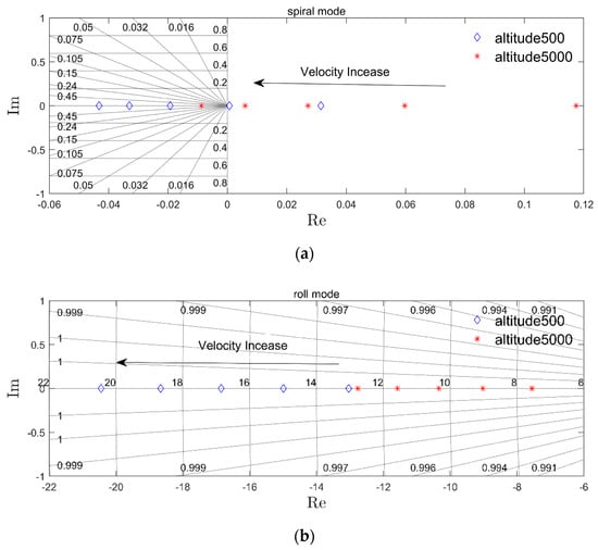 It can be seen from Figure 11a,b that, when flying at high altitude, the characteristic root of roll mode and spiral mode moved to the right of the complex plane compared with that at low altitude, and the flight quality became worse.