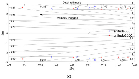 The change of system characteristic roots with different altitude and speed in lateral-directional mode. (a) Spiral mode. (b) Roll mode. (c) Dutch roll mode.