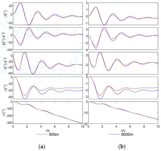 Compared with the flight at low altitude, the response frequency of the UAV at high altitude was almost the same, but the amplitude was larger, which is consistent with the result in the Figure 11 that the system damping decreased as the altitude increased. After the convergence of shock, the effect of rudder control sideslip at different altitudes was basically the same, while the effect of high-altitude control was better than that of low-altitude control.
