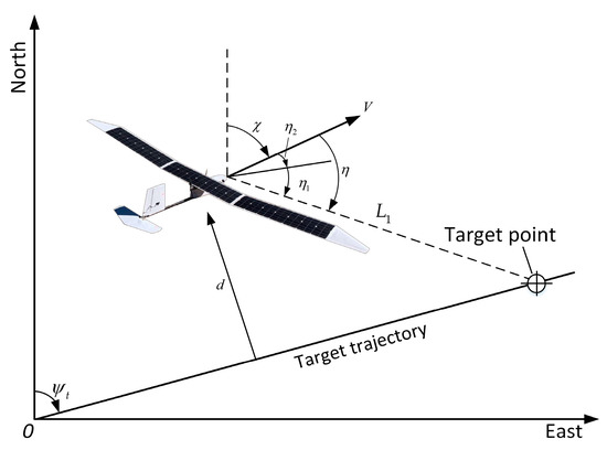 The outer loop was a straight-line trajectory tracking by the L1 method [21], Figure 14 shows the path diagram of UAV and linear target. In the figure, d is track error, L1 is the distance between conference point and UAV, V is velocity component of the horizontal plane, χ is the flight path angle, as is expected lateral acceleration, and ψt is the azimuth angle of target trajectory. The control instruction of horizontal trajectory tracking based on L1 method is shown in Formula (28).