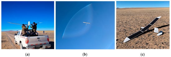 The high-altitude field experiment of UAV in Qiangtang, Tibet: (a) Vehicle-mounted takeoff, (b) cruise phase for mission, (c) hard landing in extreme environment.