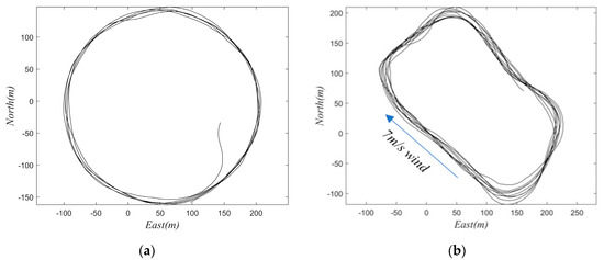 From the circular flight path (Figure 18a), it can be seen that the aileron-free UAV tracked the path well under the condition of no wind, and the flight trajectory had almost no overshoot. Figure 18b shows the situation of the UAV tracking a quadrilateral flight path with 7 m/s positive wind. The UAV tracked the path well on the upwind side. However, on the downwind side, the flight path had overshoot. In general, the aileron-free UAV achieved the required path tracking for the mission, although maybe the tracking was less accurate than aileron UAV in windy conditions.