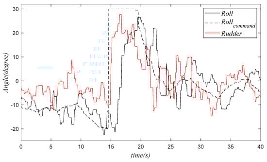 Figure 19 shows the data of the roll angle and rudder deflection when the UAV changed from a circular flight path to a straight-line flight path, which means the UAV turned left from the clockwise circular route and entered a straight-line flight path. As seen in the figure, the roll angle command appeared at 15 s with a command value of 30 degrees, and the rudder deflected after 0.3 s and a deflection value of 28 degrees after 1.5 s. The roll angle response time was slightly slower, about 5 s, because the roll angle of the aileron-free UAV was not directly caused by the rudder deflection but by the sideslip, which was an indirect process for the rudder. In general, the response characteristics of the roll angle were consistent with the simulation results.