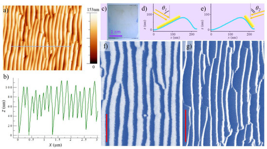, (a,b) AFM topography and cross-section line profile of the nanopatterned glass template; (c) Picture of the sample: the plasmonic nanostructures homogeneously extend over large area (cm2); (d,e) sketch of the glancing angle Au evaporation growth on the wide and on the narrow facets, respectively; and (f,g) SEM images of the tilted Au nanostripe arrays grown under condition of panel (d,e), respectively. The red scale bars in panel (f,g) correspond to 500 nm and 1 µm, respectively.