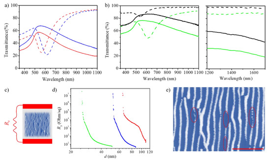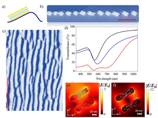 Alternatively, the optical response of these templates can be modulated by performing Au evaporation on the narrower facets (Figure 1e,g). Under this condition, the template imposes a reduction of the antennas’ width in the range of 80 nm, with a possibility to finely tailor this parameter by changing the metal evaporation angle (θ2). The optical response of the quasi-1D array obtained for θ2, respectively fixed at 50° (green curves) and 70° (black curves), is shown in Figure 2b for the near-UV, VIS and near-IR spectrum, and detected up to a 1800 nm wavelength. In analogy to the wider nanostripe samples, a narrow-band plasmonic resonance is detected under TM-polarized illumination (dashed curves), which blue-shifts from 620 nm to 540 nm wavelengths as a consequence of the increase of the aspect ratio (i.e., a decrease of w) under more grazing Au growth. Remarkably, a strong dichroism is detected in the near-IR spectral range, where the transparency exceeds the 90% for transversal polarization (TM), while is attenuated in the range of 20%–40% for TE polarization at about a 1600 nm wavelength. The latter behavior is due to the high reflectivity of the film along the non-resonant polarization, suggesting the possibility of achieving a macroscopic electrical transport parallel to the nanostripes’ long axis.