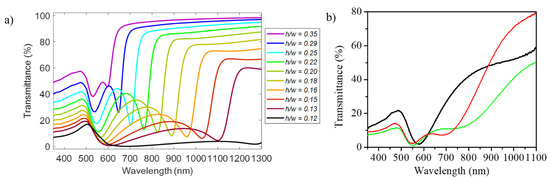 The simulations of Figure 4a clearly show a strong red-shift of the MD mode from about 600 nm to 1300 nm wavelength, as the aspect ratio h/w decreases from 0.35 (violet curve) to 0.12 (black curve), while the spectral position of the ED mode is here weakly dependent on the morphology. In parallel, both the ED and the MD mode are characterized by a pronounced spectral broadening as h/w decreases, with a subsequent reduction of efficiency in terms of field enhancement. Note that this trend in broadening is precisely in line with the hybridization mechanism, according to which the plasmonic resonances of the hybridized system (nanostripe dimer) basically inherit the broadening of the plasmonic resonance of the individual monomers, which for a nanostripe increases with decreasing values of h/w [37,38].