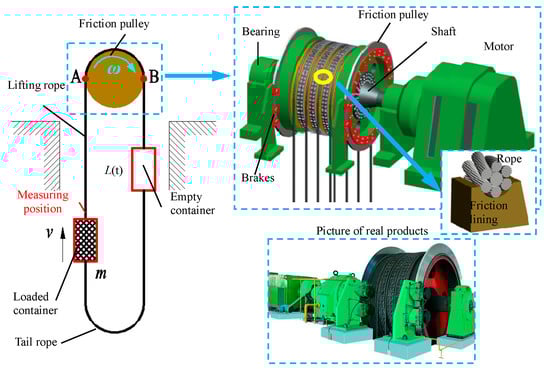 Multi-rope friction hoists are widely used in deep and ultra-deep coal mine hoisting for their remarkable advantages, such as their large capacity, high lifting height, high safety factor, low power consumption, small machine size and cost-effectiveness. The friction hoist (Figure 1) relies on the friction force between the rope and the pulley to transport goods or staff. With the development of modern large-scale friction hoisting, the problems of dynamic characteristics, which are not obvious in low-speed and light-load conditions, are gradually reflected, for example, in rope vibration and slippage [1,2]. During dynamic operations, especially in severe conditions such as acceleration and emergency braking, the long-distance suspended rope will produce large elastic vibrations and tension impacts under the influence of the terminal heavy container [3,4,5]. The vibration impact produces not only longitudinal tension, but also horizontal and torsional vibration due to the transmission of the shock wave [6,7]. Especially when the depth and speed of the mine are continuously increasing, the time-varying characteristics of the rope length and the swirl of the wellbore gas flow [8] at the bottom of the container caused by the rapid speed change will intensify the vibration [3,9]. When the vibration is transmitted upward to the friction pulley along the rope, it leads to abnormal contact, dynamic slip and even disengagement [10] between the rope and pulley, which will seriously reduce the friction stability. Therefore, it is of great importance to combine the suspended ropes on both sides of the pulley with the wrapped rope on the pulley in order to accurately obtain their dynamic behaviors. Especially for the rope on the pulley, its effective friction contact with the pulley is an important guarantee for the working efficiency and anti-skid safety of the hoist. Many scholars have conducted abundant research on the dynamics of suspension rope hoisting systems. Kaczmarczyk [11,12] established the classical distributed parameter dynamic model of the kilometre hoisting rope based on Hamilton’s principle and described the transverse-longitudinal coupling dynamic response for the first time. On this basis, Zhu [13] calculated the dynamic responses of a one-dimensional system with a spatial discretization method. The method was applied to study the longitudinal, transverse, and coupled vibrations in moving elevator cable-car systems [14]. Meanwhile, a rope vibration parameter analysis based on Hamilton’s principle has also been widely conducted [15,16,17].