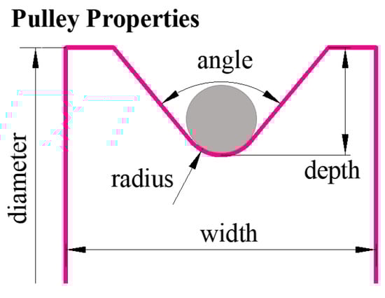 The rope is located in the groove of the pulley. The sizes of the rope grooves are shown in Figure 3. The contact geometry of the groove and the discrete rope sphere is spherical to cylindrical, i.e., the inner cylindrical surface of the groove contacts the outer spherical surface of the rope. Hertzian contact theory is then applied to calculate both the contact force and friction force, and then the resultant force is obtained. The definition of friction is given in [1], and the dimensional parameters include the Depth, Radius, Angle and contact parameters k, e, and cmax. Their specific values are shown in Table 3.