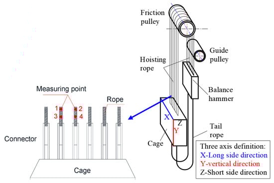 Vibration testing scheme of the wire rope above the cage.