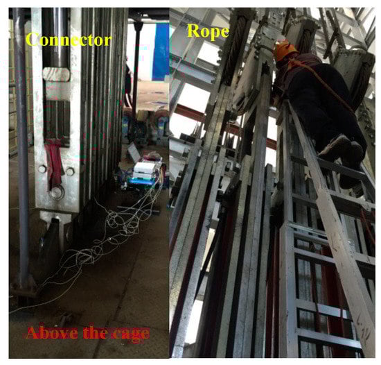 The vibration of the steel wire rope on the top of cage is tested by a portable multi-channel vibration measuring instrument system. The test location and the definition of vibration direction in this paper are described in Figure 5, and the field test process is shown in Figure 6.