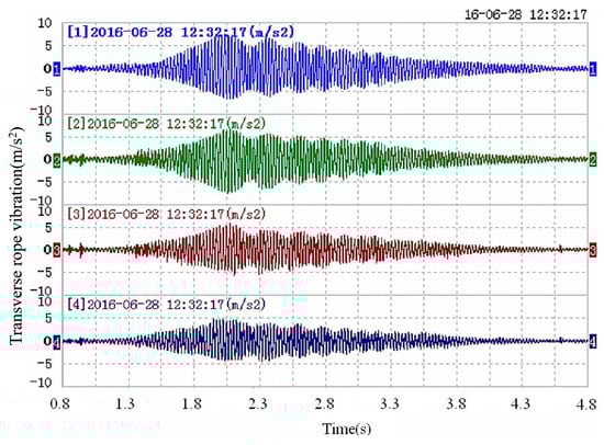 Figure 7 shows the transverse rope vibration waveform (as shown in Figure 5, cage short side direction, measuring point 1, 9.95 m/s speed lifting). The main characteristic of each measuring point is unstable vibration similar to spindle amplitude during the acceleration process. The unstable vibration of spindle type lasts about 3 seconds, and then the rope operates smoothly. The amplitudes at points 1 and 2 are greater than those at points 3 and 4 because points 3 and 4 are closer to the container. The positions of point 1 and point 2 are relatively far from the binding connector, and the flexible characteristics of the wire rope are more easily stimulated.