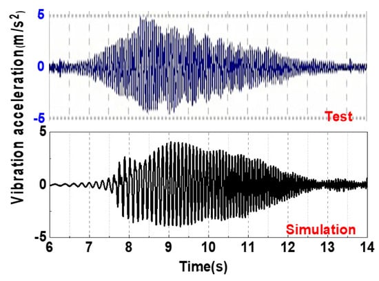 Figure 9 shows the simulation and test signals of the transverse (cage short side) vibration of the 5th rope element (0.5m above the cage). The simulation results of the first 14 s are intercepted. The simulation results are in good agreement with the field test. Similar dynamic nonstationary phenomena occur in the acceleration stage, i.e., the “spindle”vibration. The characteristics of both can be divided into two stages. In the period of unstable vibration, the amplitude of the first third increases, while that of the second third decreases. They are close in amplitude, extremum and duration. Spectrum analysis shows that the frequencies of each signal are close to 16 Hz. The high similarity indicates that the simulation model achieves high accuracy and reliability.