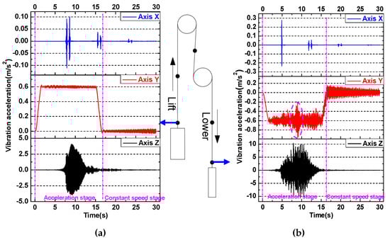 Vibration acceleration in three directions of the rope at 0.5 m. (a) Above the cage; (b) above the hammer.