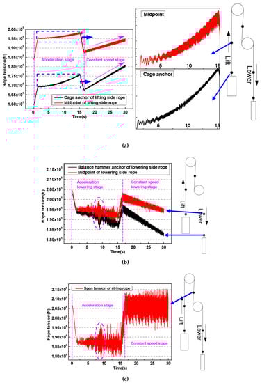 Dynamic rope tension at the different positions. (a) Tension at anchor and midpoint of lifting side rope; (b) Tension at anchor and midpoint of lowering side rope; (c) Tension at midpoint of the string rope.