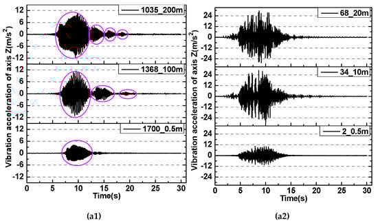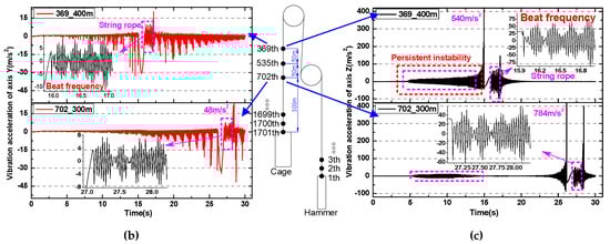 It is necessary to extract some discrete elements of the model that can bypass the pulley to obtain the wrapping dynamics of the rope. The discrete starting point of the rope model is located at the anchor of the hammer, with the serial number of the 1st element, and then the number increases until the anchor of the cage, i.e., the final 1701th element. We extract some rope elements at the whole meter to facilitate the intuitive understanding of its position. Figure 12 shows the vibrations of the 702th and 369th rope elements with initial positions 300 m and 400 m above the cage, respectively. The main vibrations in the X direction are still the sudden peaks at individual positions. The distinct demarcation characteristics in the Z and Y directions indicate that the rope is bypassing the friction pulley. The rope vibration in the Z direction near the friction pulley is the most severe. Even unstable “spindle” vibration appeared at 300 m above the cage. The rope at both positions has significant nonstationary vibration between 5 and 15 s. However, the rope of 400 m is close enough to the friction pulley, which causes the nonstationary vibration to be cross-linked with the amplitude intensification caused by approaching the pulley. The phenomenon reveals the reason that vibration intensification and abnormal noise appear in many friction hoisting system containers [13,14] at the end of the lifting stage.