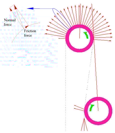 Figure 13 shows the force lines between the rope and the pulleys. Each force line represents the interaction force between a rope element and the groove on the pulley. This force can be decomposed into normal contact and friction.