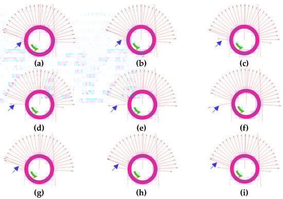 Figure 14 shows the process of the force change in the transmission operation. Nine consecutive calculation points are selected in the constant speed stage. The blue arrow indicates the entire process of a rope element from the beginning to the wrap angle until it fully contacts the friction pulley. Numbers a–f indicate an increasing force. For numbers e–f, the force line direction has a significant downward migration compared with a–c. By number g, the force line shifts upward in the reverse direction and even crosses the force line of the previous element. It can be seen from g, i that as the rope gradually enters the wrap angle, the force line starts to be stable and evenly distributed.
