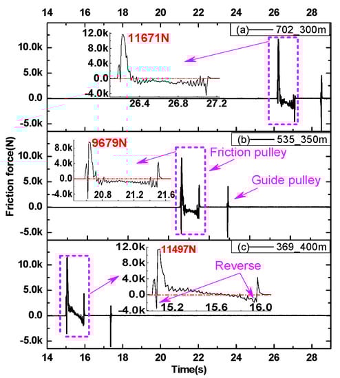 Figure 16 shows the friction forces between the rope elements and the pulley’s surface. It can be found that there are reverse values of the friction force in both the friction pulley and guide pulley. The friction force increases immediately after the rope is wrapped onto the friction pulley. The friction forces all have reverse peaks in the course of rising, which is similar to the results in [20]. The reason for this is that the rope tension decreases after entering the wrap angle, which results in rope deformation at the tangent point. The deformation direction is the same as the pulley rotation and the deformation speed is not less than the pulley edge linear speed, thus causing a reverse friction force. The maximum friction of the selected rope elements can reach 11,671 N before falling back rapidly to a reverse value. This shows that the rope is again deformed in the same direction as the friction pulley after the rope enters the second half of the wrap angle.