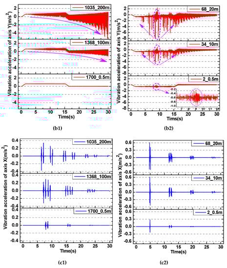 Rope vibration in three directions in the process of wrapping the friction pulley. (a) X-axis—short side direction of the cage; (b) Y axis—vertical direction of the cage; (c) Z-axis—long side direction of the cage.