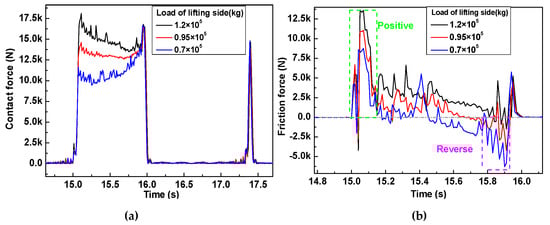 Figure 19 shows the contact force and friction force between the 369th rope element (the initial position is 400 m above the cage) and the friction pulley under different lifting side loads. Among them, 1.2 × 105 kg of lifting side load corresponds to heavy lifting, 0.95 × 105 kg is equal-weight lifting, and 0.7 × 105 kg is light load lifting. It can be found that the initial value of the contact force just entering the pulley depends on the load ratio on both sides. Because there is a constant load at the lowering side, the contact force at different lifting sides changes to the same value after bypassing the wrap angle. However, under any load, the wire rope will produce positive effect friction as soon as it enters the wrap angle, and will provide reverse friction when it is about to be wound out. The greater the lifting side load is, the smaller the reverse friction.