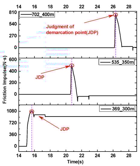 Integrating the friction force of the three rope elements in Figure 16 with time, as shown in Figure 20, the friction impulse of each rope element appears to have a downward inflection point when wrapping the friction pulley. That means that the friction drive of the pulley to the rope has changed from positive to the reverse. Until this point, friction has been beneficial to friction transmission; after this point, it has adverse effects. Combined with Figure 16, the friction force in the wrap angle can be divided into two regions by the judgement of the demarcation point (JDP). This is essentially different from the traditional static and dynamic angle theory—the static angle does not provide friction, and the dynamic angle provides a positive friction effect [19,21,24,25]. The theory holds that the tension does not change when the rope of the lifting side just enters the wrap angle (static angle), i.e., the rope does not provide any friction due to deformation and slippage. When the rope reaches the dynamic angle, the friction is caused by the creep between the rope and pulley [26,27].