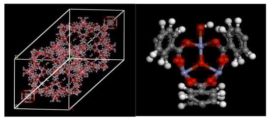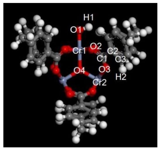 When calculating the CO2 adsorption, the charge of MIL-101 (Cr) cannot be ignored because of its strong quadrupole moment. The DMol3 module in Materials Studio was used to calculate the atomic charge. Because MIL-101 (Cr) has an ordered symmetry structure, the intercepted cluster was used as a model for calculating the charge (as shown in Figure 2), and the truncated part was calculated by the methyl saturation method [27,28,29]. The charges of the adsorbents and the adsorbates are shown in Table 4.