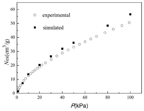 The adsorption isotherms that are made by different adsorption capacities can be obtained at different pressures. In general, the experimental measurement represents the excess adsorbed amount, and the GCMC simulation result represents the absolute adsorbed amount. In this paper, the absolute adsorbed amounts that were obtained by GCMC simulations were converted to excess adsorbed amounts in order to perform a comparison with the experimental data, and the amount of excess adsorbed molecules Nex was calculated using Equation (2):