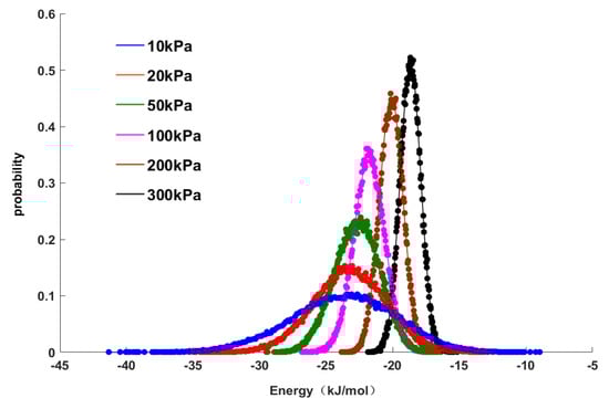 When calculating the adsorption isotherm, the adsorption energy reflecting the strength of the interaction between an adsorbent and an adsorbate can also be obtained. In this process, the adsorption energy was not constant. As summarized in Table 5, the absolute value of the adsorption energy decreased, as the pressure increased, indicating that the interaction between the adsorbent and the adsorbate decreased as the pressure and adsorption capacity increased. Figure 4 shows the characteristics and distributions of the adsorption energy. The data points in Figure 4 represent the distribution points of the adsorption energy characteristics determined by GCMC molecular simulations, and the curve represents the curve fitted by a normal distribution model in the mathematical software MATLAB to correlate all data points. It can be seen in Figure 4 that the normal distribution model had a good regression effect for the data points. Under different pressures, the values of the distributions of adsorption energy were different, but they all obeyed a normal distribution. The purpose of this study is to explore the relationship between adsorption energy and pressure, so the average value of the adsorption energy was used in subsequent work and is shown as the peak value of the normal distribution (Figure 4). As the pressure increased, the peak value of the normal distribution shifted to the right, and the distribution area of adsorption energy narrowed, that is, the absolute average value of adsorption energy decreased. This result indicated that the adsorption was gradually weakened, which was also consistent with the change in adsorption energy shown in Table 5. From the above results, it can be seen that the average adsorption energy was correlated with the adsorption pressure, that is, there was a linear relationship between them that can be expressed as follows: