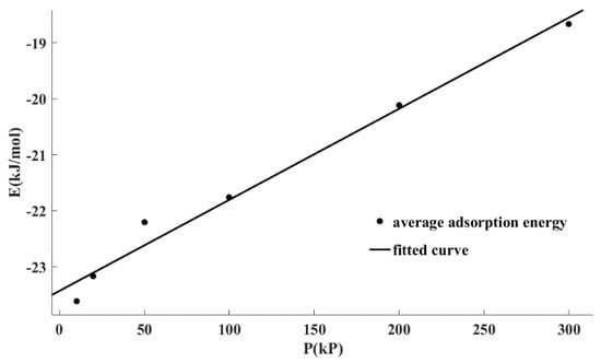 Figure 5 shows the fitting correlation curve of the average adsorption energy data points under different pressures using Equation (3). It can be seen that Equation (3) can well describe the relationship between the adsorption energy and pressure. It also can be seen from Table 6 that the determination coefficient (R2) for linear regression was greater than 0.98 and the residual sum of squared estimate of errors (SSE) was only 0.12. In conclusion, there was a linear relationship between the adsorption energy and the adsorption pressure, which can be written as Equation (3).