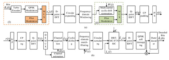 The remainder of this paper is organized as follows. In Section 2, we present the system model of the proposed DBT-MC-FTN system and propose the corresponding receiver that takes consideration of the influence of a multipath fading channel. Furthermore, a soft SIC equalizer has also been provided to estimate the self-introduced interference. In Section 3, the methodologies of implementing the two pilot transmission and channel estimation schemes have been introduced, respectively. Section 4 provides the channel estimation (CE) and bit error rate (BER) performance results of the proposed scheme. Finally, Section 5 includes the conclusions and future work.