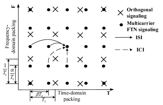 where is the continuous-time unit energy pulse with the Nyquist symbol interval , M, and D are, respectively, the numbers of occupied subcarriers and the symbols transmitted on each subcarrier. and denote the frequency packing factor (FPF) and the time packing factor (TPF), respectively. We set as the joint time-frequency packing factor. For and , an orthogonal system is obtained, while for or , frequency-domain or time-domain packing occurs between the subcarriers or symbols. Figure 2 illustrates the time-frequency grid comparison between the multicarrier FTN system and the orthogonal systems, from which the relationship between the desired signal and introduced ISI/ICI can be recognized clearly. As a result, the improvement of spectral efficiency is obvious.