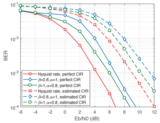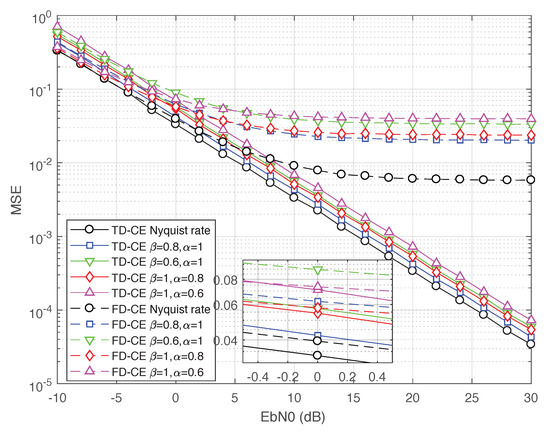 Firstly, as shown in Figure 4, the MSE curves of TD-CE and FD-CE schemes using non-orthogonal DBT-MC-FTN pilots over the TU6 channel are evaluated. The performance at Nyquist rate, i.e., is set as the performance bound. For TD-CE, it is evident that, with the increase of and , the MSE results are gradually reduced to approach the bound. This is because the ISI/ICI introduced by two-dimensional packing in the system gradually decreases with the increase of the packing factors. Similar results occur when FD-CE is implemented and it can be observed that TD-CE can obtain a more accurate channel estimation than FD-CE at low . When it comes to high , an error floor occurs. The reason behind this is that the ISI/ICI introduced by packing and the out-of-band emission (OOBE) caused by the filter trailing can be dealt with in the case of TD-CE, but the single-tap FD-CE only considers the diagonal elements of . Thus, even in the case of no packing, the error floor still occurs due to the effects of the filter and this effect is related to the sideband shape of the filter, e.g., the roll-off of the root-raised cosine (RRC) filter.