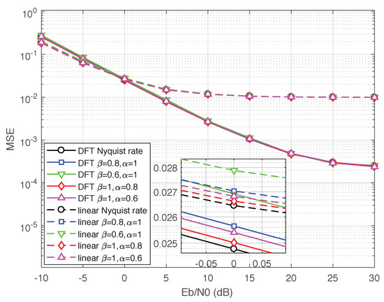 Next, the MSE performance of LS channel estimation using orthogonal pilots is investigated in Figure 5. The linear and DFT interpolation methods have been utilized, respectively. It can be observed that, under the condition of LS channel estimation, DFT interpolation performs better than linear interpolation although the error floor occurs in both two interpolation methods compared to that of the TD-CE in Figure 4. Thus, an improved interpolation scheme can be implemented for higher accuracy, but it is not the focus in this paper. Furthermore, slight performance loss occurs when the system is compressed. The reason is that the increment in the power of the data symbol due to the packing results in a slight deviation of the SNR, which is negligible. Therefore, we can conclude that the performance of channel estimation using orthogonal pilots is not affected by the packing of the system, as mentioned.