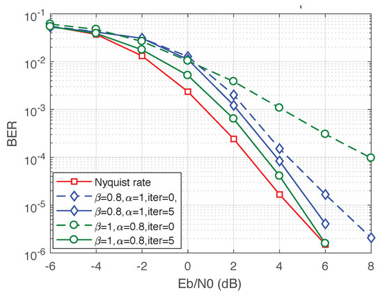 Furthermore, the BER performance of the proposed channel estimation in the DBT-MC-FTN system using orthogonal pilots have been shown in Figure 6 and Figure 7, respectively. First, to investigate the BER performance of the proposed SIC, a perfect CSI of AWGN channel is assumed to neglect the effect of the channel estimation effect. As shown in Figure 6, the performance of Nyquist rate system, i.e., is set as the performance bound and it can be observed that with the packing in the time or frequency domain, the BER performance performances a certain loss compared to the orthogonal system. With the increase in the number of the iteration, the BER performances will be improved gradually to approach the performance bound. It is observed that the BER performance with FPF can save up to 25% of bandwidth with a performance loss of less than 0.5 dB at with five iterations while there is a little performance penalty of about 1 dB in the case of the system with TPF . Hence, we can conclude that the proposed soft SIC has a better effect on the ICI introduced by frequency domain packing than the ISI introduced by time domain packing.