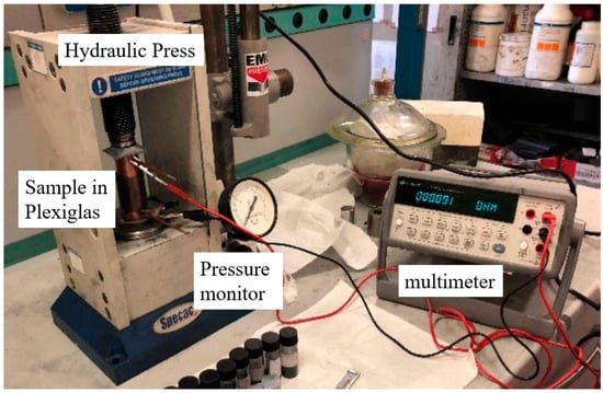 The electrical resistance of the powders was measured at increasing loads (up to 1000 bar) applied by a hydraulic press (Specac Atlas Manual Hydraulic Press 15T). Electrically insulating sheets were placed between the conductive cylinders and the load surfaces in order to ensure that the electrical signal passed through the sample. The resistance of the carbon fillers was measured using an Agilent 34401A multimeter. From the values of the resistance, R, the conductivity, σ, can be calculated by: