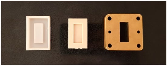 The composite samples were measured in a rectangular waveguide structure, as shown in Figure 2. Samples of specified dimensions needed to be fabricated to fit in the waveguide structure. For this purpose, appropriate molds made of silicone were first fabricated from a 3D-printed master mold. Silicone molds are reusable and flexible. This helps in easy extraction of composite samples once they are polymerized. For the fabrication of the composite samples for measurements in the waveguide, a pre-weighted quantity of biochar filler was mixed in epoxy resin using a mechanical mixer. A hardener was added to the mixture to help in polymerization. This mixture was then transferred to the silicone molds. Once polymerized, the samples were extracted from the molds for measurement.