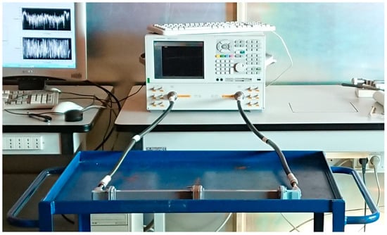 After the samples were produced, they were fit into a metallic holder, which was connected between the ends of a rectangular waveguide. The rectangular waveguide was the WR 90, which operates in the X-band (8 GHz to 12 GHz) of the microwave frequency spectrum. The internal dimensions of the waveguide were 22.86 mm × 10.16 mm. The Vector Network Analyzer (VNA) used for measurements of the scattering parameters was Agilent E8361A. The measurement setup is shown in Figure 3. The ports of the VNA were connected to the waveguides by means of coaxial to waveguide adapters. A standard procedure for waveguide calibration was adopted before the measurements were collected, which consisted of reflection, transmission and isolation (often omitted). The measurements were performed using calibration standards (short, load and through).