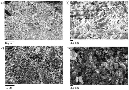 FESEM captures of (a,b) non-thermal annealed and (c,d) thermal annealed sludge derived biochar at different magnifications.