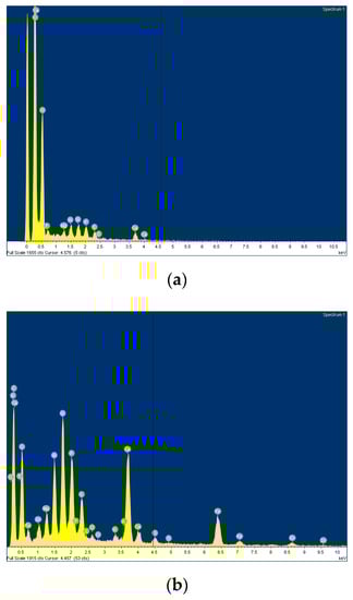 Non-thermal annealed sludge biochar has a slightly rough surface on both a large and reduced scale. Using a high magnification, grains with an average dimension of around 1 μm can be observed. Thermal annealed sludge biochar has a very rough surface with similar grains. In this case, the grains are smaller and more defined with respect to the carbonaceous matrix. This could be explained by the results of the EDX analysis shown in Figure 6 and in Table 1. This analysis maps an area of around 60 × 60 µm (mapping images).