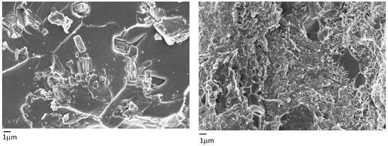 FESEM analysis was performed on the composites with 10 wt.% and 20 wt.% of biochar in order to study the biochar dispersion. The results are shown in Figure 7. A higher content of biochar can be seen in the composite with 20 wt.% biochar as compared to the composite with 10 wt.%. In both cases, a good dispersion of the filler was observed in the different sample portions analyzed. Furthermore, a rise in inorganic content led to a more granular structure in the composites.