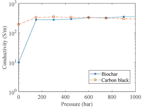 The value of conductivity obtained in the case of carbon black shows a gradual increase with increasing pressure. The values of conductivity for low pressure values in Figure 8 are comparable to the ones reported previously []. Pressure values similar to the values used in this study were adopted in []. The values of conductivity obtained in [] were higher because of a higher temperature (>2000 °C) treatment on the carbon black.