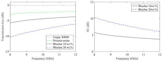 The transmission loss of the empty waveguide, the pristine resin and samples with 10 wt.% and 20 wt.% of sludge biochar are shown in Figure 9 (left panel). It can be seen that the addition of biochar reduces the value of transmission. The shielding effectiveness values for the biochar composites are shown in Figure 9 (right panel). For a composite sample with 10 wt.% biochar, the SE is almost 5 dB, which increases to 10 dB for a sample with 20 wt.% biochar. In order to achieve a further increase in SE, the biochar weight percentage can be increased. The thickness of the sample in this case is 4 mm; an increase of thickness can result in a further increase of the SE.