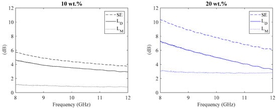 As reported in Section 2.2, the shielding effectiveness can be split between the reflective and dissipative losses. In Figure 10, the reflective loss, dissipative loss and the total shielding effectiveness for the composites with 10 wt.% and 20 wt.% are reported. It can be seen that the dissipative losses increase with the increase in the filler weight percentage.