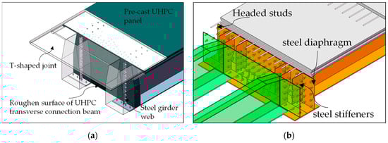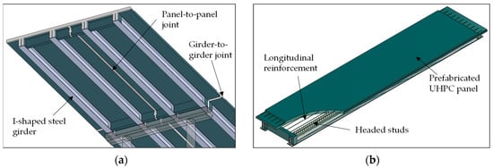 The fully precast lightweight steel-UHPC composite bridge (LWCB), as shown in Figure 1a, consists of several π-shaped steel-UHPC composite girder components (Figure 1b). Each prefabricated component is composed of one UHPC panel and two I-shaped steel girders, which are connected by headed studs. In the transverse direction of the LWCB, the prefabricated components are connected by panel-to-panel joints, while in the longitudinal direction, they are assembled together by girder-to-girder joints.