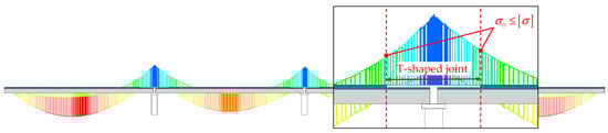 Figure 2 shows the typical bending moment envelops of a continuous beam bridge. It is seen that the negative bending moment of the main beam reaches the maximum value at the top of the pier, and gradually decreases from the peak region to the two sides. Owing to the high tensile strength of UHPC, it may be considered to cast UHPC on-site in the negative bending moment area near to the support. Note that the interfacial strength between the poured UHPC and the prefabricated part is weak due to the discontinuity of the steel fiber, the weak interfaces are thus set in the areas with relatively lower negative bending moment. As shown in the right side of Figure 2, the T-shaped UHPC joint in the negative bending moment area is proposed to significantly decrease the interfacial cracking risk during the service life. It has a lengthened top that looks like the letter “T” from the side view; thus, it was named a “T-shaped joint”. Besides, the prestressed system commonly used in the negative bending moment area can be avoided, which greatly speeds up the on-site construction time.
