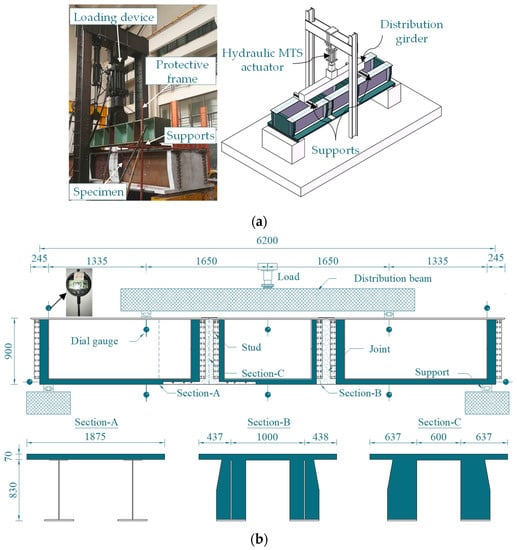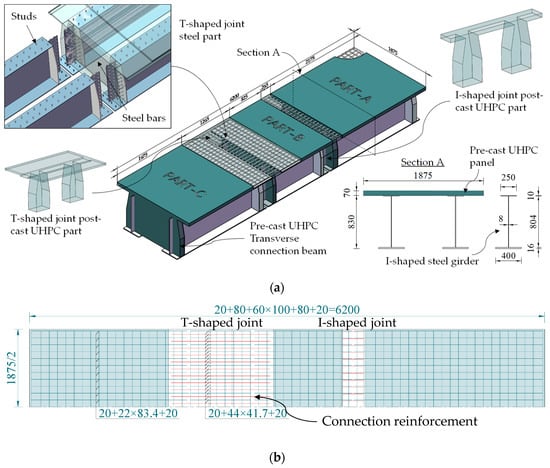 As shown in Figure 3a, the specimen is 6.2 m long and 1.875 m wide, composed of two joints and three prefabricated steel-UHPC composite girder elements, termed as part A, part B, and part C. The T-shaped joint is employed to connect two prefabricated components of part B and part C, and the other one is the traditional I-shaped joint (from the side view, the joint is shaped like the letter “I”) connecting part A and part B.