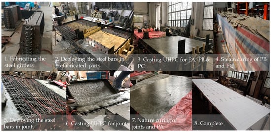 The main fabrication process is shown in Figure 4: (1) fabricating the I-shaped steel girders; (2) deploying the steel bars in pre-cast parts (part A (PA), part B (PB), and part C (PC)); (3) casting UHPC for prefabricated components; (4) steam curing of part B and part C; (5) deploying the steel bars in post-cast joint parts (T- and I-shaped joints); (6) casting UHPC for the joint parts; (7) natural curing of part A and joint parts; and (8) completing the experimental model. It is worth noting that the process is identical to the actual construction sequence.