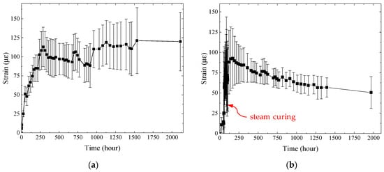 As can be seen in the figure, for the natural curing part (Figure 7a), the shrinkage increased rapidly in the first 250 h, then fluctuated until the end of the test. The strain was in the range of 87–173 με, and the average value was 121 με. While for the steam curing part (Figure 7b), the strain increased rapidly during the curing period (48 h), then showed a slight decrease; the maximum value was 164 με. Also, 2000 h (83.3 days) later, the shrinkage strain was in the range of 30–76 με. The maximum shrinkage strain of the reinforced UHPC deck was 173 με under natural curing, and was 164 με under steam curing. Compared to past research [,,,,,,], it is seen that the reinforcement has a significant effect on UHPC material shrinkage.