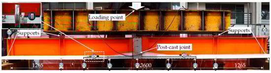 For the loading convenience of the experimental test, the specimen was inversely configured to produce a negative bending moment. The specimen was simply supported on the bottom supports, as shown in Figure 5a. In order to ensure that the two joints were under the same load, the specimen was loaded in the form of four-point bending, the hydraulic MTS (Testing systems, Mechanical testing, and Sensing solutions) actuator was employed to apply the loading to the model. Before loading, a careful visual inspection on the UHPC panel indicated that there were no visible shrinkage-induced cracks, and thus the natural curing scheme of the joint was considered to be feasible. During the test, the deflection of the mid-span and the crack development of the UHPC panel were recorded step-by-step. The configuration of the measurement points and the distribution of the dial gauges and dial indicator are shown in Figure 5b.